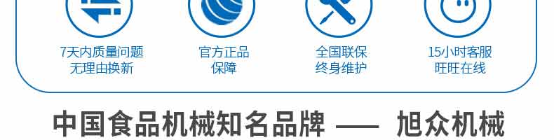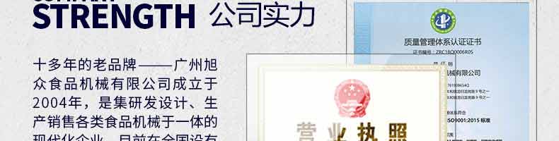 廣州旭眾食品機(jī)械有限公司是一家集科研開(kāi)發(fā),生產(chǎn)設(shè)計(jì),營(yíng)銷(xiāo)服務(wù)為一體的現(xiàn)代化生產(chǎn)企業(yè)?,F(xiàn)代化生產(chǎn)車(chē)間,精湛制造技術(shù),所產(chǎn)機(jī)械歷經(jīng)市場(chǎng)重重考驗(yàn),不斷贏得海內(nèi)外客戶(hù)的贊譽(yù)。