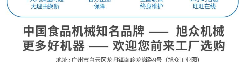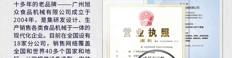 廣州旭眾食品機械有限公司是一家集科研開發(fā),生產(chǎn)設(shè)計,營銷服務為一體的現(xiàn)代化生產(chǎn)企業(yè)?,F(xiàn)代化生產(chǎn)車間,精湛制造技術(shù),所產(chǎn)機械歷經(jīng)市場重重考驗,不斷贏得海內(nèi)外客戶的贊譽。