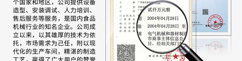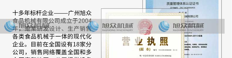廣州旭眾食品機(jī)械有限公司是一家集科研開發(fā),生產(chǎn)設(shè)計(jì),營(yíng)銷服務(wù)為一體的現(xiàn)代化生產(chǎn)企業(yè)?,F(xiàn)代化生產(chǎn)車間,精湛制造技術(shù),所產(chǎn)機(jī)械歷經(jīng)市場(chǎng)重重考驗(yàn),不斷贏得海內(nèi)外客戶的贊譽(yù)。
