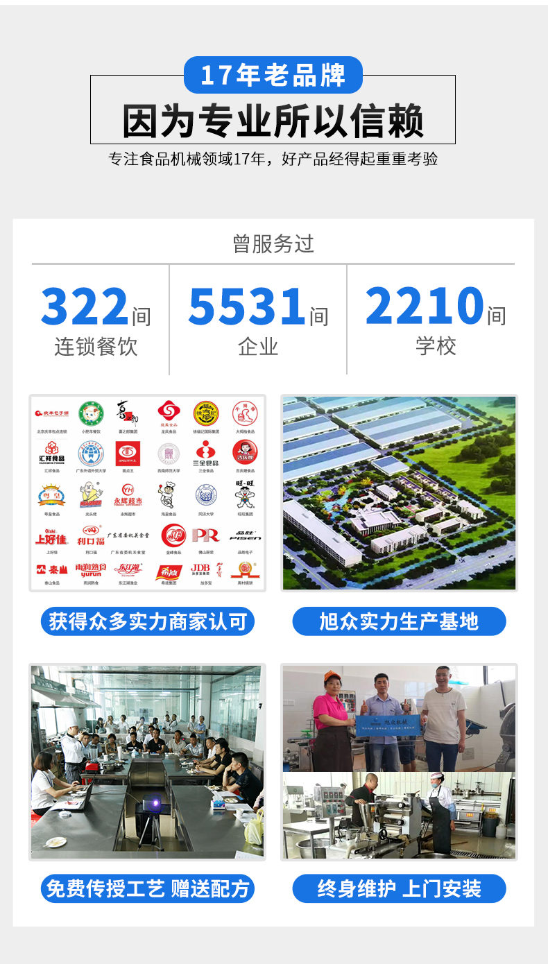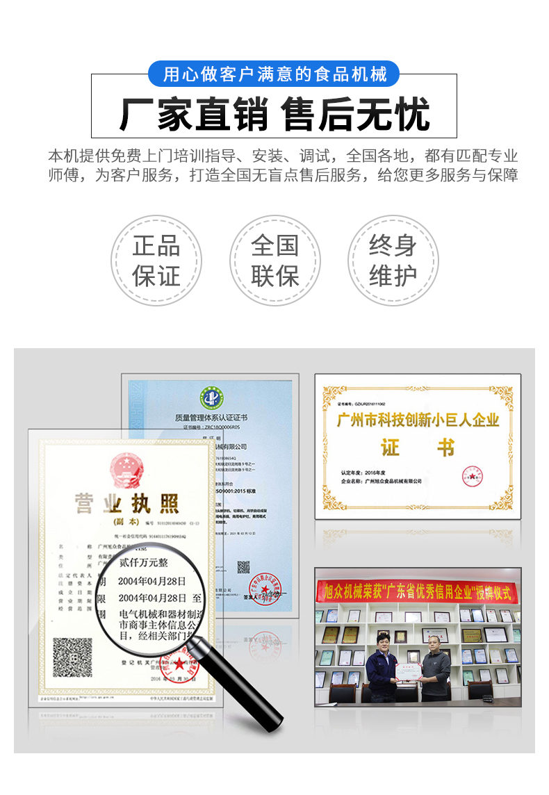 廣州旭眾食品機(jī)械有限公司是一家集科研開發(fā),生產(chǎn)設(shè)計(jì),營銷服務(wù)為一體的現(xiàn)代化生產(chǎn)企業(yè)。現(xiàn)代化生產(chǎn)車間,精湛制造技術(shù),所產(chǎn)機(jī)械歷經(jīng)市場(chǎng)重重考驗(yàn),不斷贏得海內(nèi)外客戶的贊譽(yù)。