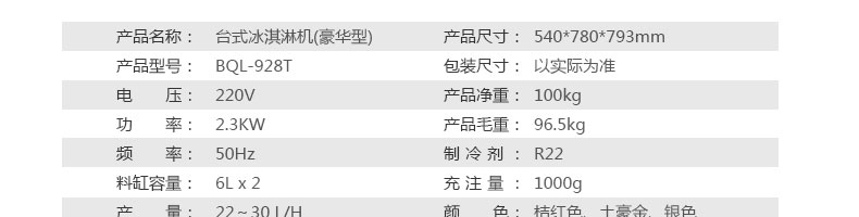 BQL-928T臺式冰淇淋機,1.選用國際牌壓縮機,輔以旭眾精湛工藝,大大縮短冰淇淋成型時間,高效節(jié)能;2.全新液晶智能觸控面板,簡單明了,多功能易操作;3.全新升級專業(yè)膨化泵,膨化率高,產量增加30%;4.一鍵清洗功能,省時方便;5.主要部件采用不銹鋼材質,時尚美觀,持久耐用;6.先進的機械攪拌系統(tǒng),機器運行穩(wěn)定可靠,低噪音,產品口感爽滑細嫩。