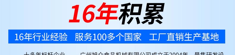 廣州旭眾食品機械有限公司是一家集科研開發(fā),生產(chǎn)設計,營銷服務為一體的現(xiàn)代化生產(chǎn)企業(yè)。現(xiàn)代化生產(chǎn)車間,精湛制造技術,所產(chǎn)機械歷經(jīng)市場重重考驗,不斷贏得海內(nèi)外客戶的贊譽。