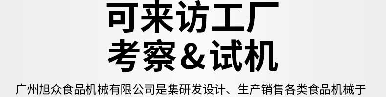 廣州旭眾食品機械有限公司是一家集科研開發(fā),生產(chǎn)設(shè)計,營銷服務(wù)為一體的現(xiàn)代化生產(chǎn)企業(yè)?,F(xiàn)代化生產(chǎn)車間,精湛制造技術(shù),所產(chǎn)機械歷經(jīng)市場重重考驗,不斷贏得海內(nèi)外客戶的贊譽。