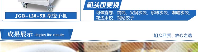 JGB-120-5B型餃子機(jī),本機(jī)是一款可生產(chǎn)各種肉餡、肉菜混合餡、全菜餡及其他種餡餃子的設(shè)備。一機(jī)多用途,只要更換模具,就可制作不同的食品,如春卷、餛飩、咖喱角、鍋貼等。適用于賓館、飯店、餐廳、團(tuán)體食堂加工,幼兒園、速凍餃子生產(chǎn)。