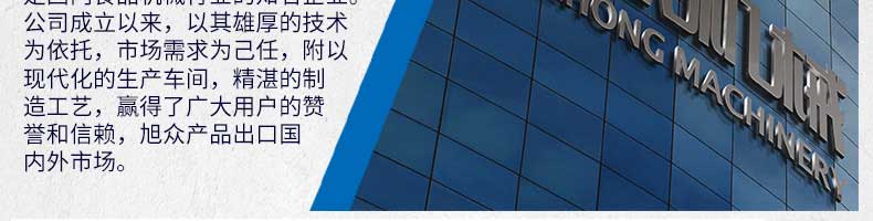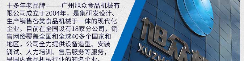 廣州旭眾食品機(jī)械有限公司是一家集科研開發(fā),生產(chǎn)設(shè)計(jì),營(yíng)銷服務(wù)為一體的現(xiàn)代化生產(chǎn)企業(yè)。現(xiàn)代化生產(chǎn)車間,精湛制造技術(shù),所產(chǎn)機(jī)械歷經(jīng)市場(chǎng)重重考驗(yàn),不斷贏得海內(nèi)外客戶的贊譽(yù)。