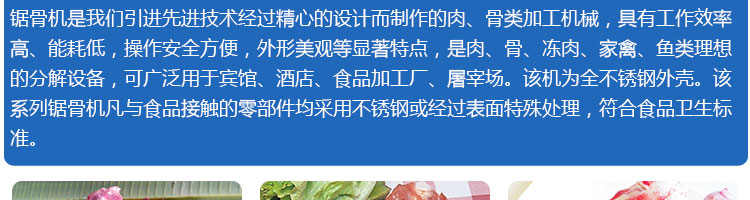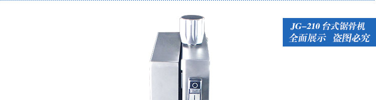 JG-210臺(tái)式鋸骨機(jī),適用于各類骨頭,冷凍肉,帶魚(yú)骨,冰塊,冷凍魚(yú)的分割。采用全不銹鋼材料制作,具有工作效率高,操作安全的特點(diǎn)。廣泛適用于食品加工廠,屠宰場(chǎng),肉類加工廠等