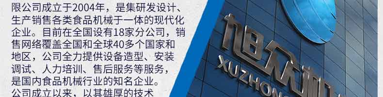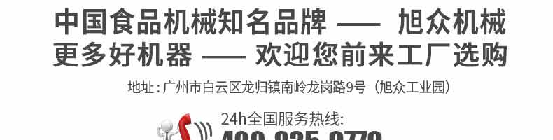廣州旭眾食品機械有限公司是一家集科研開發(fā),生產設計,營銷服務為一體的現(xiàn)代化生產企業(yè)?,F(xiàn)代化生產車間,精湛制造技術,所產機械歷經市場重重考驗,不斷贏得海內外客戶的贊譽。