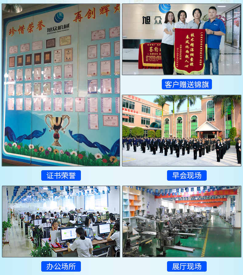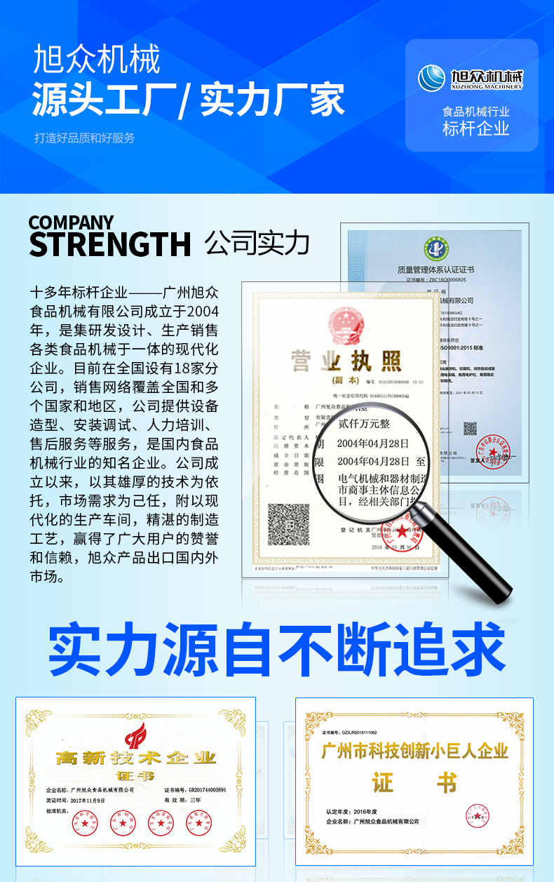 廣州旭眾食品機械有限公司是一家集科研開發(fā),生產(chǎn)設(shè)計,營銷服務(wù)為一體的現(xiàn)代化生產(chǎn)企業(yè)?,F(xiàn)代化生產(chǎn)車間,精湛制造技術(shù),所產(chǎn)機械歷經(jīng)市場重重考驗,不斷贏得海內(nèi)外客戶的贊譽。