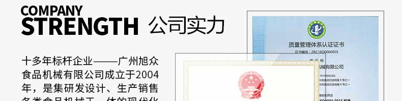 廣州旭眾食品機械有限公司是一家集科研開發(fā),生產(chǎn)設(shè)計,營銷服務(wù)為一體的現(xiàn)代化生產(chǎn)企業(yè)?,F(xiàn)代化生產(chǎn)車間,精湛制造技術(shù),所產(chǎn)機械歷經(jīng)市場重重考驗,不斷贏得海內(nèi)外客戶的贊譽。