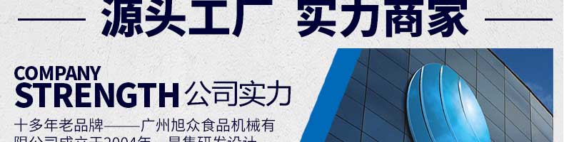 廣州旭眾食品機(jī)械有限公司是一家集科研開發(fā),生產(chǎn)設(shè)計(jì),營銷服務(wù)為一體的現(xiàn)代化生產(chǎn)企業(yè)?,F(xiàn)代化生產(chǎn)車間,精湛制造技術(shù),所產(chǎn)機(jī)械歷經(jīng)市場(chǎng)重重考驗(yàn),不斷贏得海內(nèi)外客戶的贊譽(yù)。