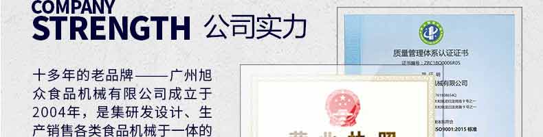 廣州旭眾食品機(jī)械有限公司是一家集科研開(kāi)發(fā),生產(chǎn)設(shè)計(jì),營(yíng)銷(xiāo)服務(wù)為一體的現(xiàn)代化生產(chǎn)企業(yè)。現(xiàn)代化生產(chǎn)車(chē)間,精湛制造技術(shù),所產(chǎn)機(jī)械歷經(jīng)市場(chǎng)重重考驗(yàn),不斷贏得海內(nèi)外客戶的贊譽(yù)。