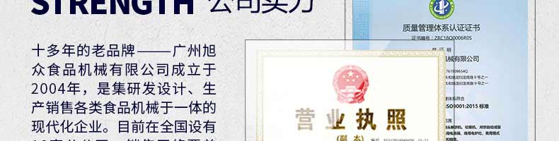 廣州旭眾食品機械有限公司是一家集科研開發(fā),生產(chǎn)設計,營銷服務為一體的現(xiàn)代化生產(chǎn)企業(yè)。現(xiàn)代化生產(chǎn)車間,精湛制造技術(shù),所產(chǎn)機械歷經(jīng)市場重重考驗,不斷贏得海內(nèi)外客戶的贊譽。