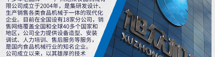 廣州旭眾食品機(jī)械有限公司是一家集科研開(kāi)發(fā),生產(chǎn)設(shè)計(jì),營(yíng)銷服務(wù)為一體的現(xiàn)代化生產(chǎn)企業(yè)?,F(xiàn)代化生產(chǎn)車間,精湛制造技術(shù),所產(chǎn)機(jī)械歷經(jīng)市場(chǎng)重重考驗(yàn),不斷贏得海內(nèi)外客戶的贊譽(yù)。