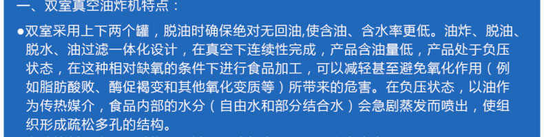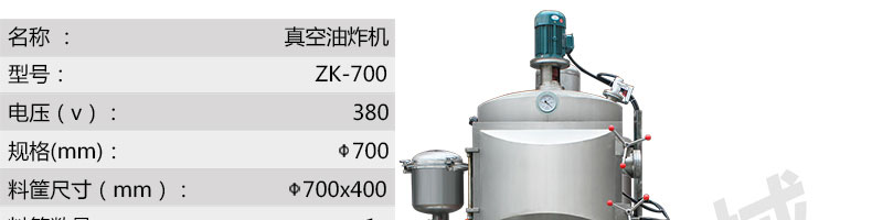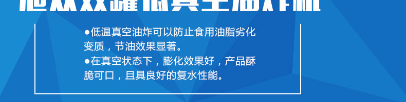zk-700雙室低溫真空油炸機(jī),適用于水果類、蔬菜類、干果類、水產(chǎn)品機(jī)畜禽肉類等。自動(dòng)控制溫度,無過熱、無過壓,確保產(chǎn)品質(zhì)量和安全生產(chǎn)。